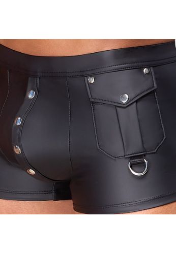 Deze nauwsluitende boxershort combineert fetisj-stijl met functionaliteit. Zwart mat met zilveren details, verborgen rits in het kruis. Aan de ene kant ringen en 3 verwijderbare kettingen met karabijnhaken, aan de andere kant cargozak met rits. Zacht en elastisch met bedekte elastische tailleband voor maximaal comfort.