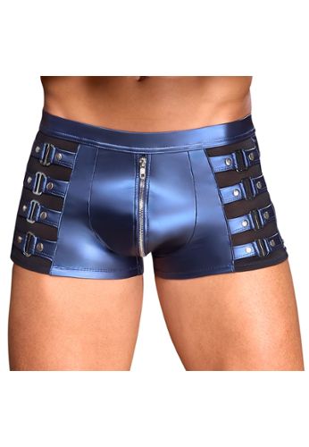 Een boxer ontworpen om de mannelijke anatomie te benadrukken. Stuk in metallic blauw mat look met zijdelingse riemen versierd met klinknagels, zwarte netinzetten en rits op het gevoerde zakje voor een gedurfd en comfortabel BDSM-look.