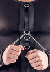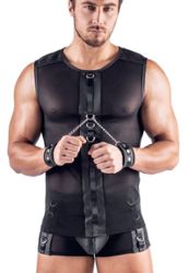 Indossate la canottiera delicatamente. Fissate le manette agli anelli di trattenimento utilizzando le catene moschettone. Regolate i polsini velcro per comfort ottimale. Assicuratevi che tutti gli elementi siano ben fissati prima dell'uso. Fermatevi immediatamente in caso di disagio. Usate sempre in accordo con il vostro partner e stabilite parole di sicurezza chiare.