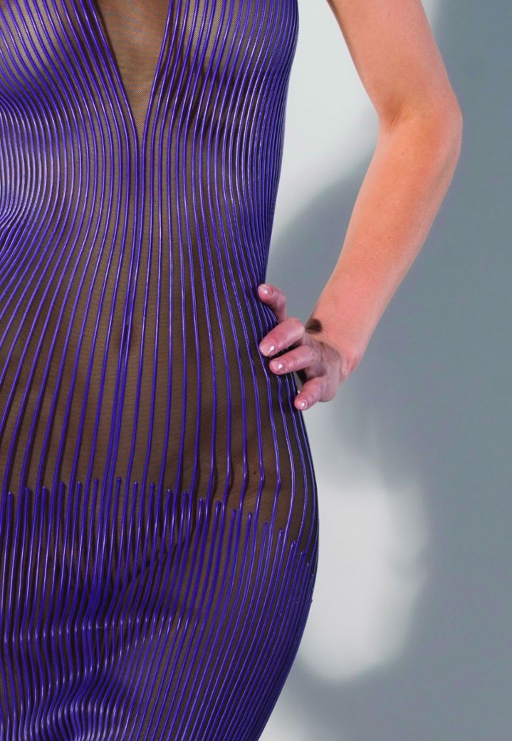 Un outfit spettacolare, questo abito in latex con motivo a righe viola!
