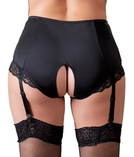 Deze open slips met hoge taille en afneembare kousenband staan helemaal in het teken van gedurfde verleiding, met hun delicate bloemenkant en volle kruisopening.