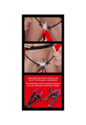Questo perizoma è stato concepito come accessorio per il gioco, ma con la semplicità della lingerie: lo si infila, lo si regola e ci si diverte. Le clip sono posizionate sulle labbra della vulva per tenerle separate ed esporre il clitoride. Utilizzate le viti di regolazione per scegliere la pressione: molto leggera per un delicato stuzzicamento, o più decisa se preferite sensazioni più intense.