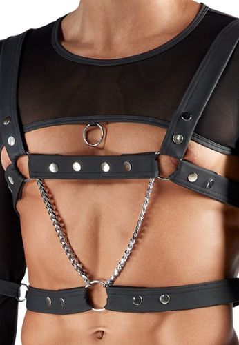 Un harnais uomo in cuoio vegano nero, combinando stile, comfort e funzionalità. Il collare regolabile può essere indossato da solo o con la cinghia centrale staccabile. Due anelli inclusi (metallo e gomma) o usa il tuo. Bottoni e anelli in nero opaco per un look discreto e molto efficace.