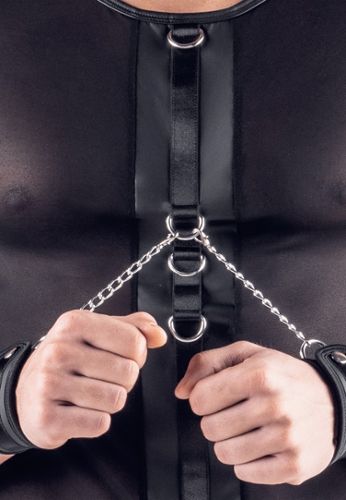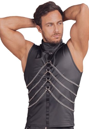 Questo t-shirt senza maniche di livello premium combina design elegante e stile fetish. Nero opaco con accessori argentati, colletto alto con chiusura a pressione. Gli anelli anteriori e posteriori sostengono le 4 catene removibili con moschettoni. Morbido ed elastico per comfort ottimale.