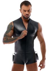 Una tuta senza maniche con design fetish completo con arnese di petto integrato. Finitura opaca sofisticata con rete su gambe corte. Cerniera frontale da collo a fianchi. Include : 2 manette morbide con velcro. 6 anelli di bondage nella parte inferiore della schiena. Materiale morbido ed elastico per un comfort eccezionale.