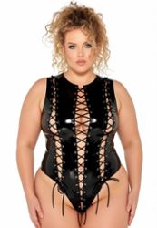 Laat je verleiden en meeslepen door deze ongelooflijke bodysuit van vinyl met vetersluiting.