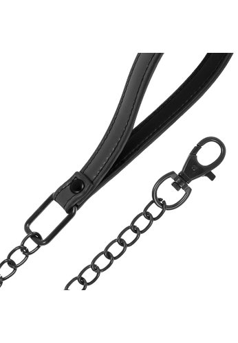 Domina a tu pareja con este completo set de sumisión, que incluye un collar de cuero vegano, pinzas ajustables para los pezones y una correa de control.