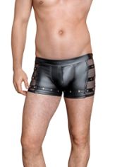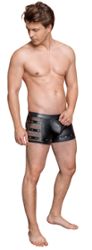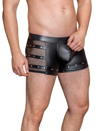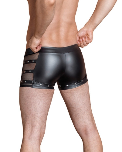 Calções boxer pretos em pele mate e aspeto de rede, com fecho de correr à frente.