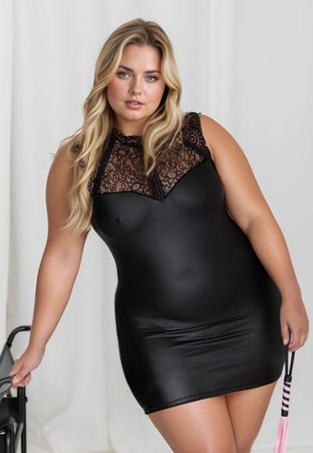 Bell'abito sagomato in ecopelle con colletto in pizzo.
