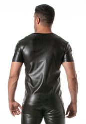 Het Kinky T-shirt is een heren-T-shirt van leerachtig datex met een slanke pasvorm, ontworpen voor een chique fetishwear-look zonder aan comfort in te boeten. De ronde kraag is tijdloos, terwijl de suède voering zacht aanvoelt tegen de huid. Discreet afgewerkt met het TOF Paris logo op de mouw, made in Paris.