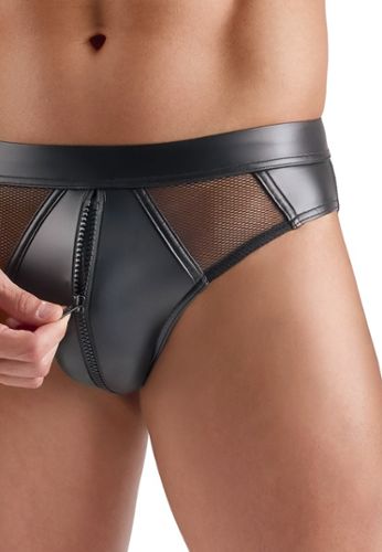 Een slip met vinyleffect om op te vallen, met een rits aan de voorkant over een ondoorzichtige zak, visnet aan de voorkant en een nauwsluitend model. Comfortabel, elastisch en geknipt voor een elegante fetish-look.