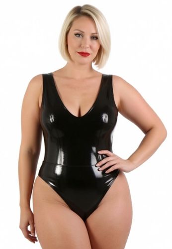 Een laag uitgesneden bodysuit van zwart vinyl, met een diep decolleté en onweerstaanbare glans. Met een rits aan de achterkant en drukknopen in het kruis is dit chique fetisjstuk ontworpen voor comfort en impact.