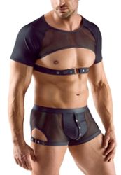 Stout shirt met borst en buik open voor een provocatieve stijl. Zwart mat gestyled met transparante netinzet vooraan. Verstelbare onderborst-riem met decoratieve ring en drukknopen. Materiaal zacht en elastisch voor maximaal comfort.