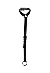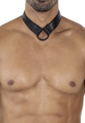 Een harnas voor mannen in zwart veganistisch leer, combineren stijl, comfort en functionaliteit. De verstelbare kraag kan alleen worden gedragen of met de centrale afneembare riem. Twee ringen inbegrepen (metaal en rubber) of gebruik uw eigen. Knoppen en ringen in mat zwart voor een discreet en zeer effectief uiterlijk.