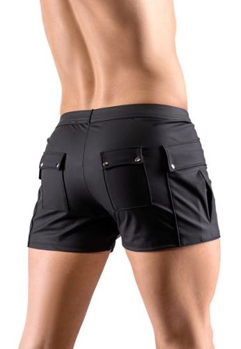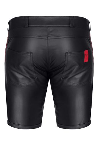 Een lage taille short in mat zwart kunstleder met ontspannen pasvorm en 4 functionele zakken. Stuk in elastisch mat zwart kunstleder 95% polyester 5% elastaan met gegraveerde RFP ritsen en rood Alcantara patch van het merk Regnes Fetish Planet, exclusief design gemaakt in Europa.