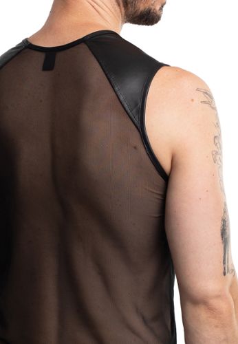 Una maglietta moderna in rete trasparente nera con inserti in similpelle su spalle e petto. Pezzo in rete elastica trasparente con dettagli in similpelle e logo RFP del marchio Regnes Fetish Planet, design esclusivo realizzato in Europa.
