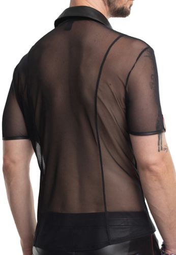 Una polo camicia in fino mesh trasparente nero con colletto ritto in wetlook e taglio slim-fit. Pezzo in mesh trasparente 95% poliestere 5% elastan con colletto ritto nero wetlook e patch Alcantara rosso inciso RFP del marchio Regnes Fetish Planet, design esclusivo realizzato in Europa.