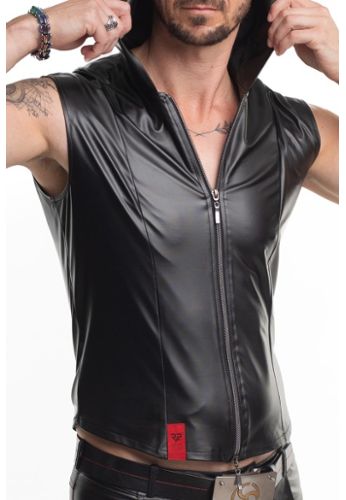 Un gilet elegante senza maniche in wetlook elastico opaco (similpelle vegana di qualità). Pezzo con cerniera bidirezionale incisa con logo RFP, cuciture verticali che affinano, etichetta Alcantara rossa firma, per una silhouette sublimata, perfetto per l'apprezzamento feticista e l'eleganza sensuale.