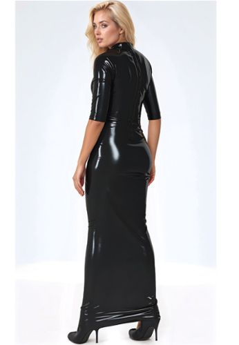 Ontdek onze natuurlijke latex jurk met hoge hals, een geraffineerde herinterpretatie van de little black dress in de fetisjwereld.