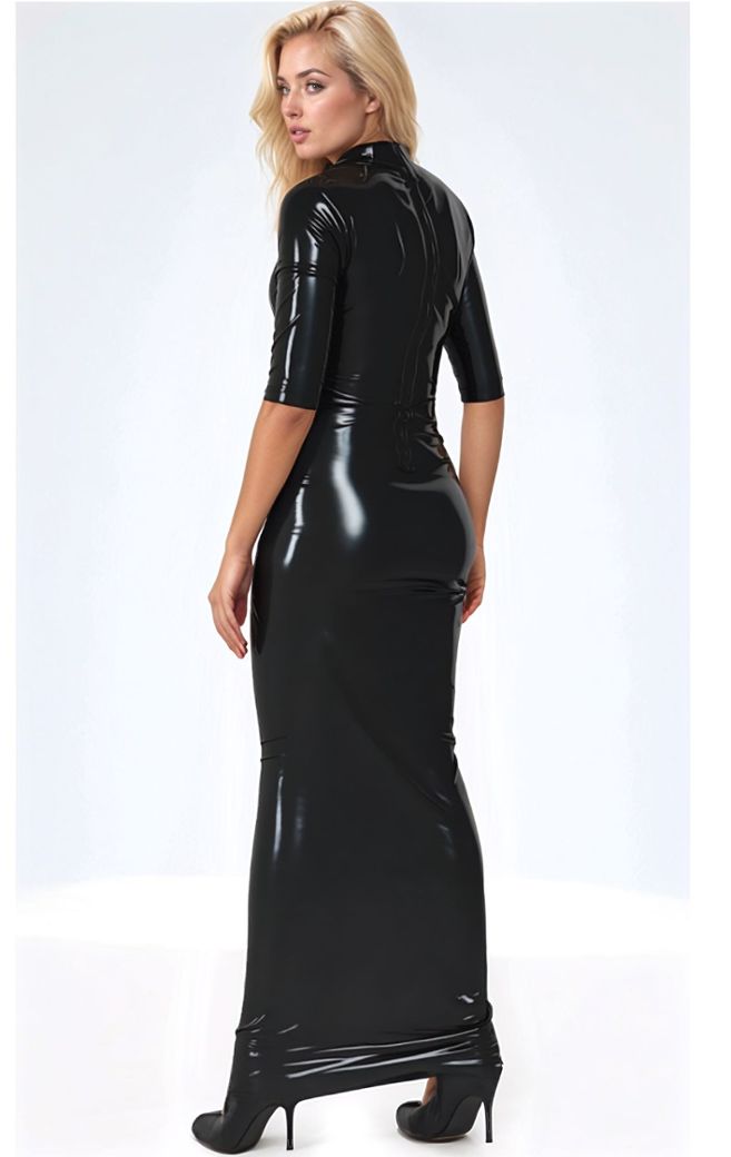 Ontdek onze natuurlijke latex jurk met hoge hals, een geraffineerde herinterpretatie van de little black dress in de fetisjwereld.