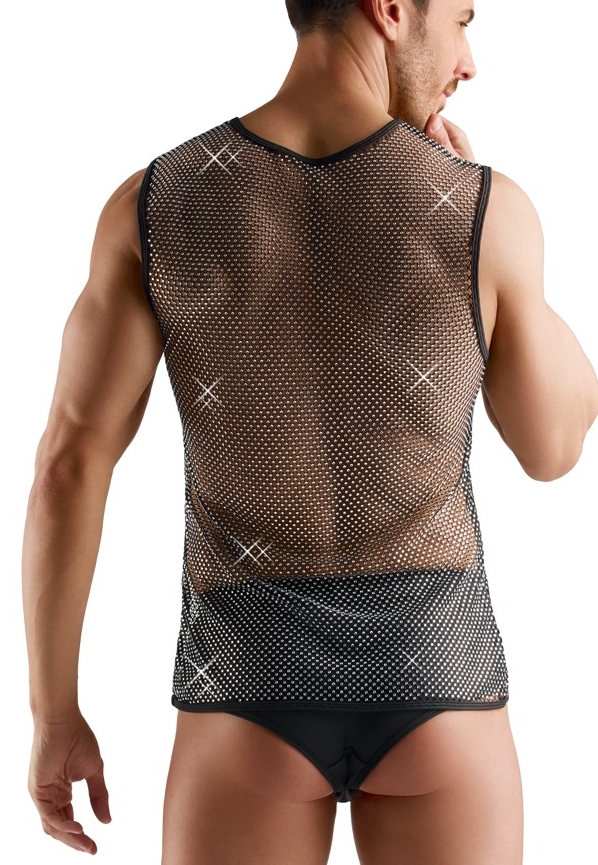 Dit mouwloze netshirt zwart combineert transparantie en glamour. Volledig bedekt met glinsterende strass voor een opvallend visueel effect. Luchtig en zacht netweefsel, optimaal comfort voor een gedurfd en provocerend look.