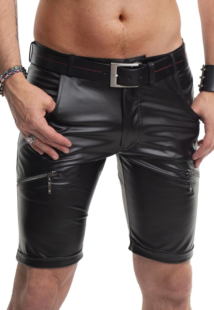 Een opvallende cargo short in mat zwart kunstleder met lage taille en 8 functionele zakken. Stuk in elastisch mat zwart kunstleder 95% polyester 5% elastaan met gegraveerde RFP ritsen en rood Alcantara patch van het merk Regnes Fetish Planet, exclusief design gemaakt in Europa.