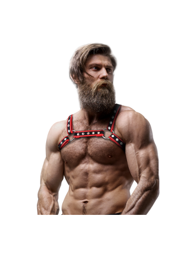 O Bulldog preto/vermelho é um arnês de peito para homem em couro vegano, criado para impacto visual imediato com um contraste bicolor. Tamanho único e totalmente ajustável, estrutura o torso com um acabamento premium e muito limpo.