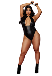 Body en similicuir extensible orné d'un cadenas et accompagné de ses menottes, elles aussi cadenassées.