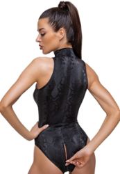 Questo incredibile body aperto è realizzato in materiale lucido e opaco con motivo a pelle di serpente.