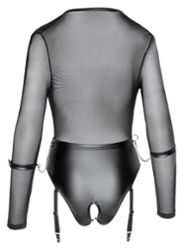 Body fetiche aberto, de mangas compridas, em rede e couro sintético.