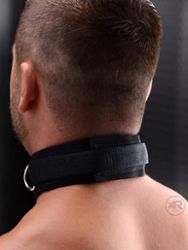 O seu parceiro está a usar uma coleira confortável com um forro de neoprene e um fecho duplo de velcro.