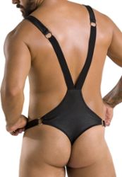 Questo body da uomo in similpelle opaca ha uno stile fetish radicale, con profonde aperture anteriori e posteriori e cinghie elastiche resistenti.