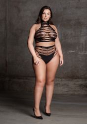 An elegant cut that leaves the shoulders exposed for this set in semi-sheer bodystocking mesh.