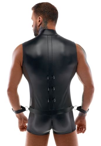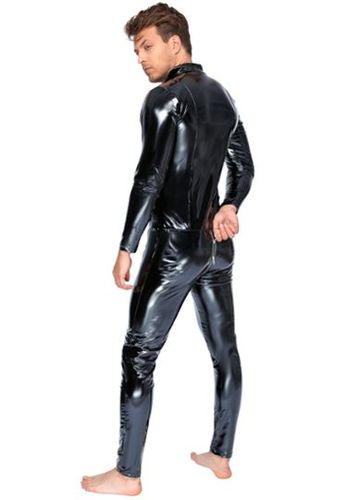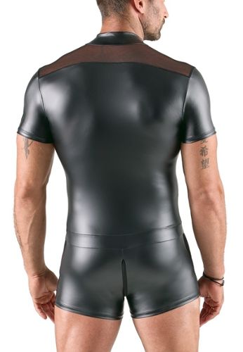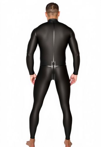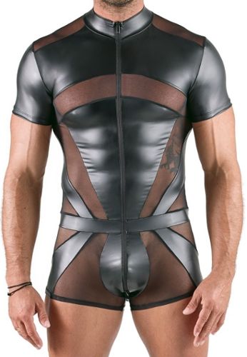 Este body fetiche de manga comprida para homem combina inserções opacas em mate e transparentes em powernet num design provocante. Com a sua gola alta e fechos de correr duplos, oferece um autêntico visual BDSM.