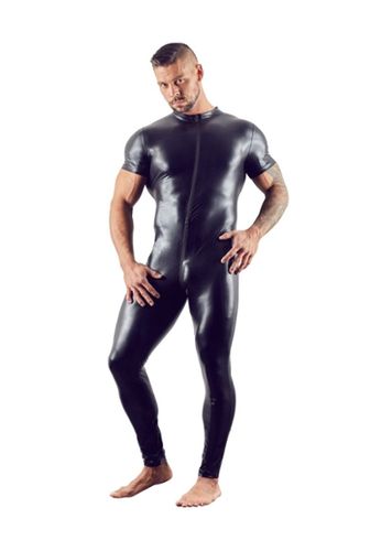 Este macacão em látex natural brilhante envolve o corpo como uma segunda pele. Com um fecho funcional na virilha, combina praticidade com extrema sensualidade.