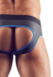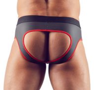 Combine este jockstrap com acessórios metálicos para um efeito muito club. O look néopreno/borracha combina perfeitamente com wetlook ou couro preto para um conjunto ultra coordenado.