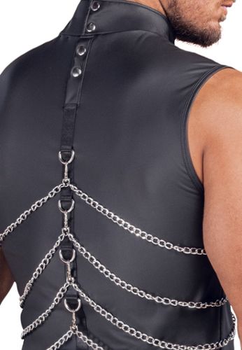 Esta camiseta sin mangas de nivel premium combina diseño elegante y estilo fetichista. Negra mate con accesorios plateados, cuello alto con cierre de presión. Los anillos delanteros y traseros sostienen las 4 cadenas desmontables con mosquetones. Suave y elástica para comodidad óptima.