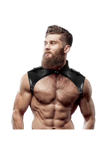 Um arnês de peito para homem em couro vegano, com duplo suporte e tachas para uma estrutura mais marcada e gráfica. Tamanho único e totalmente ajustável, define o torso com um fit premium e confortável.