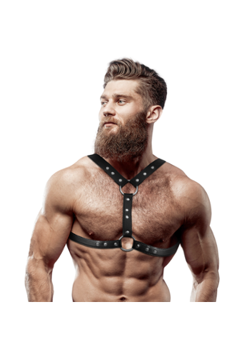 Um arnês de peito cross-over para homem em couro vegano, com tachas para mais textura e presença. Tamanho único e totalmente ajustável, o X marca o torso e cria um look premium, direto e muito visual.