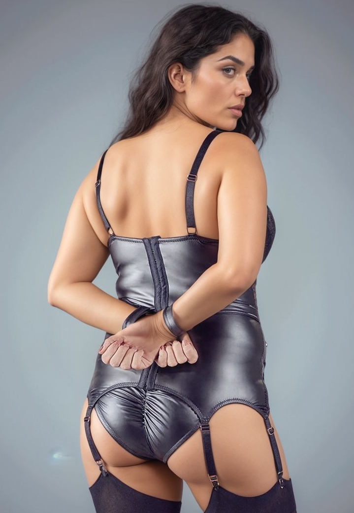 Suntuoso corpete realça seios Valky preto, cortado sob medida até o tamanho 54. Couro sintético e renda fina de qualidade, com algemas integradas nas costas, cadarço frontal, alças ajustáveis e 6 ligas ajustáveis. Calcinha a juego com clipes laterais incluída. Luxo e sensualidade garantidos.