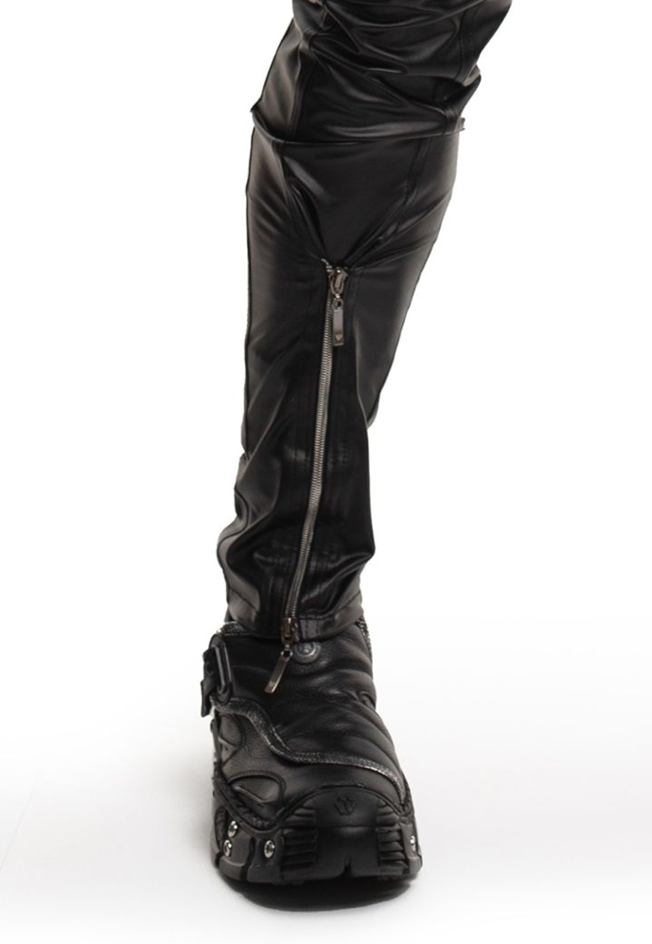 Calça moderna em wetlook elástico mate com cintura baixa. Peça com zíper bidirecional inferior frontal, 2 zíperes decorativos pernas, bolsos frente/costas, etiqueta Alcantara vermelha assinatura, para um statement fetichista forte e confortável.