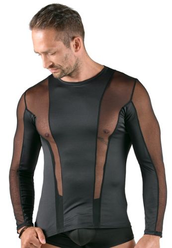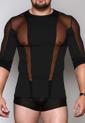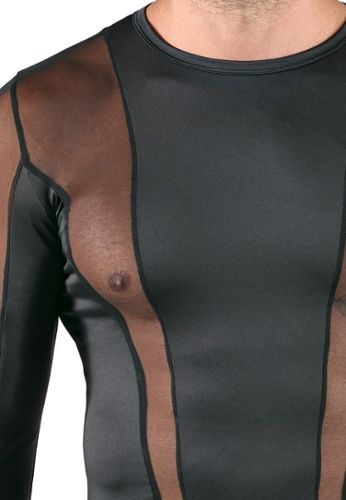 Esta revolucionária t-shirt de manga comprida para homem joga com o contraste marcante entre a rede transparente e o tecido opaco elástico.