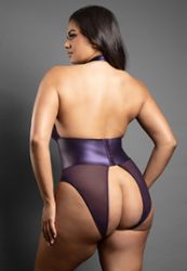 Un teddy morado de color muy original, con halter, tul y polipiel, pensado para una provocación elegante y muy erótica. Su cinturón alto extra ancho con cordones atrae todas las miradas y realza la silueta, mientras el corte es abierto en la entrepierna y en los glúteos. El antifaz a juego completa el juego.