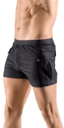 Calções pretos casuais em tecido elástico leve com um acabamento mate moderno.